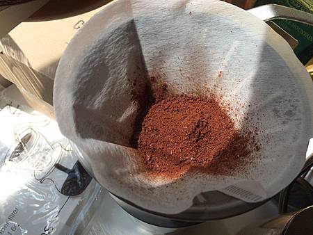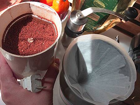 是用美國朋友家中的Krups刀片式磨豆機,顆粒粗細會不均勻。只能將就啦~