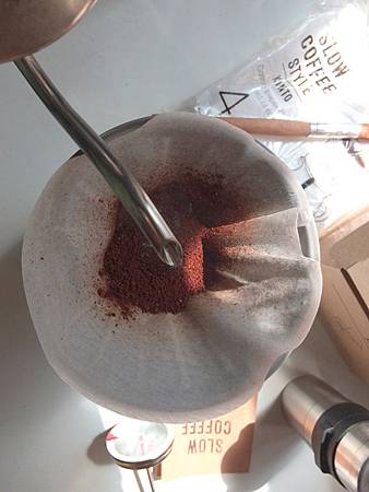 先以90度左右的熱水浸溼咖啡表面,進行熱悶15~30秒。