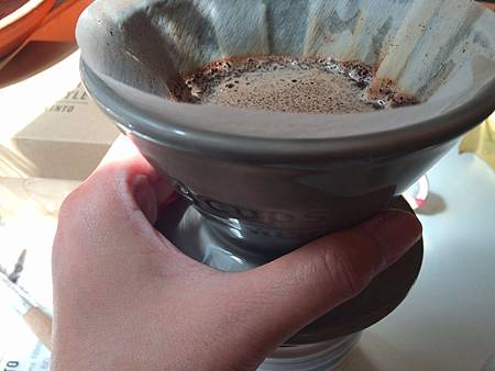 可手握濾杯,陶瓷厚實杯壁優良的隔熱性,不用擔心燙手。杯底的單孔出水孔徑大,可見得咖啡液流速不過快、也不過慢,很均勻。