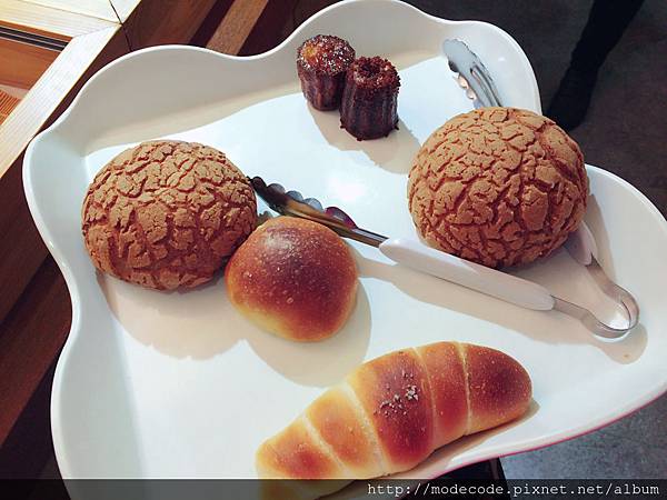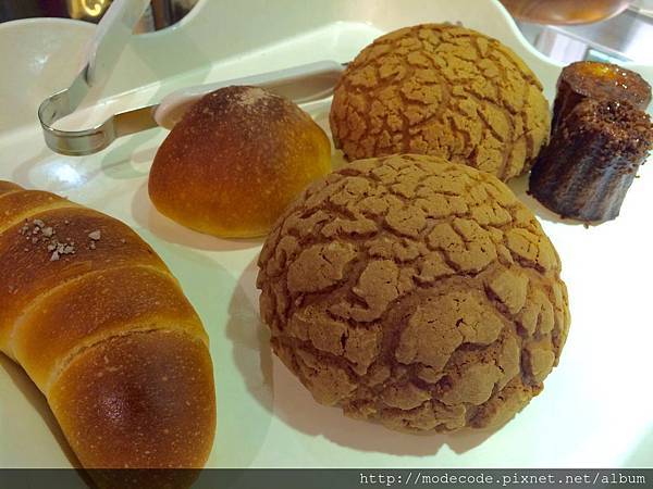 也就順便挑了幾樣:可麗露 (黑糖、蘋果口味各一)、菠蘿兩個、無鹽奶油牛角麵包一個、黑蜜紅豆麵包一個。(共NT$235)