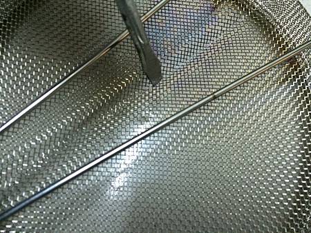 在銀杏手網底部自行加上五道凹槽,改良成較貴的進階版。進階版(如上圖)較原始版的平底網多了五道凹槽,可以增加手鍋網裡的受熱面積。